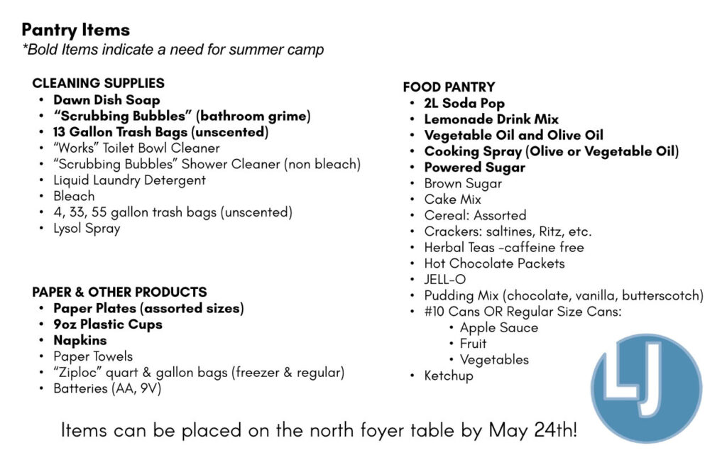 We are collecting pantry items for LJCC again this year. The full needs list is also available on our app or on the back table. Items can be placed on the north foyer table by May 24th!
